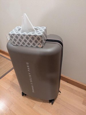 [This review was collected as part of a promotion.] (Tissue box for scale) This is a nice, solid suitcase. It has a hard shell, but it's extremely lightweight. It has four wheels and it moves very smoothly. The brown color is very classy-looking, and the lavender interior is so cute! There's a zippered section, clips, and two little pouches for extra storage. Can't wait to travel with it!