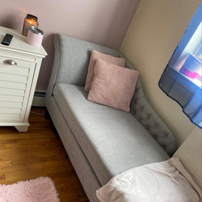 Lounge like royalty with the Florent chaise. This Victorian-inspired chaise features a graceful scroll back and single arm with lavish button tufting. Designed to add both elegance and function to your space, the Florent is crafted from sturdy wood and upholstered in a soft, foam filled fabric for the utmost relaxation. The chaise is set on top of tapered, black finished legs, adding a modern twist to this classic chaise. The Florent chaise is made in Malaysia and requires assembly.