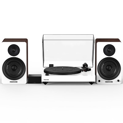 This plug and play system easily connects your turntable to the speakers without the need for a separate amplifier or AV receiver. Once the record finishes, simple push of the button on the included remote control lets you switch over the Bluetooth to stream all your favorite music apps.