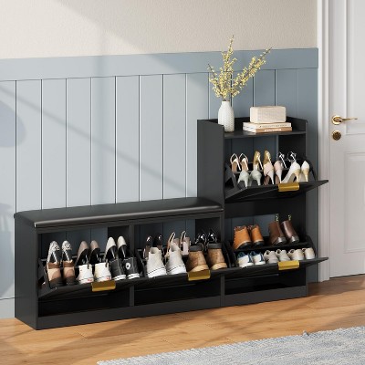 Fluted Shoe Cabinet Storage with 3 Flip Drawers, Wooden Narrow Shoe Organizer with Adjustable and Removable Shelves, Freestanding Slim Shoe Storage