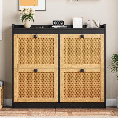 Fluted Shoe Cabinet with 2 Flip Drawers, Freestanding Hidden Slim Narrow Shoe Rack with Adjustable Shelves for Entryway-Black and Oak