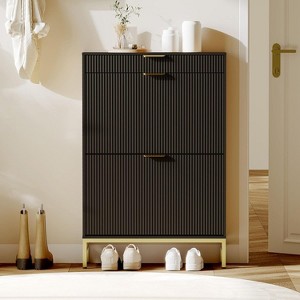 Fluted Entrance Shoe Cabinet With 2 Flip Drawers, Narrow 3 Tier Shoe Storage Organizer for Entryway Slim, Freestanding Farmhouse Shoe Rack With Metal Legs, Hidden Home Furniture Hallway Cabinet.Fluted Entrance Shoe Cabinet With 2 Flip Drawers, Narrow 3 Tier Shoe Storage Organizer for Entryway Slim, Freestanding Farmhouse Shoe Rack.Fluted Entrance Shoe Cabinet With 2 Flip Drawers, Narrow 3 Tier Shoe Storage Organizer for Entryway Slim, Freestanding Farmhouse Shoe Rack