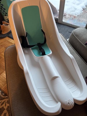 The Gizmo Riders Baby Rider is a snow sleigh for babies and infants that allows you to securely pull your child around town in the snow or on the slopes. Its angled 80-degree backrest eliminates the possibility of tipping, while the inset foam seat is gently curved to conform to the baby or toddler’s back. This comfortable polyethylene anti-slip foam seat keeps the baby or toddler in place and provides a bit of extra warmth With extra safety in mind, the Baby Rider’s 3-point safety harness ensures the child is buckled into place at all times. This sleigh has a 55 pound weight capacity and is suitable for infants ages 6 months and up to 3 years old.