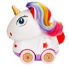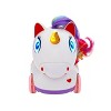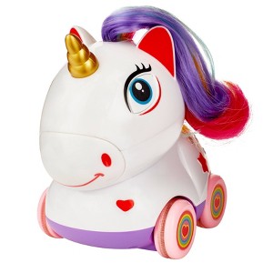 Adorable Remote Control Unicorn! Nova is a fun 2.4GHz RC vehicle for kids ages 3 and up. She has rainbow hair and her eyes light up in 6 different colors; her horn lights up too! She plays music sounds and speaks multiple phrases. Drives forward, backwards, left and right with included, easy to use, remote controller. Kid friendly and designed for safety with rounded edges. Kids will love driving Nova around the house. Requires 5 AAA batteries (not Included).