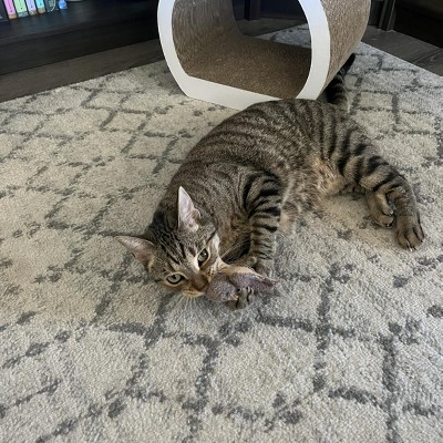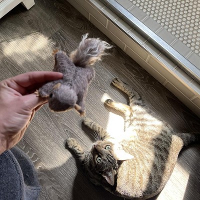 I have zero idea why, out of ALL the toys and gadgets I’ve purchased for my new cat, THIS squirrel is by far his fave. He takes it to his lair, he brings it to me to play fetch, he runs when he hears the little internal rattle. This is just a classic little stuffy that has melted my little adopted boy’s heart. He did rip the tail off, but reattaching was no problem.
