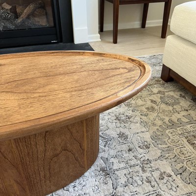 Give your living room a spark of rustic-chic warmth with this Flyte Coffee Table. Resonating with a deep sense of motion in its oval pedestal base and matching oval top, Flyte's rich natural finish seamlessly accents any contemporary-country furnishings. Care Instructions: Dust regularly with a soft, dry cloth. Never use oiled or treated cloths on lacquered finishes. Some finishes can be wiped with a damp (not wet) cloth, followed at once by rubbing with a dry cloth to remove fingerprints and smudges. For persistent spots, gently clean with a soft cloth and a solution of water and mild soap, make sure to wipe dry. Use adhesive felt pads, coasters and placemats to protect your furniture.