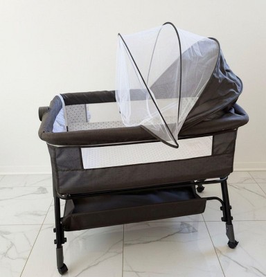 Adjustable bedside bassinet designed to keep baby close and safe through every sleepy moment. This lightweight foldable sleeper attaches securely to your bed for easy night feeding, with 3 height settings and a zip-down side for soothing and diaper changes. Breathable 3D mesh panels boost airflow and visibility, while lockable wheels ensure smooth room-to-room mobility. Includes a comfy mattress, mosquito net, large storage basket, and washable fabrics—perfect for newborns and growing babies up to 33 lbs. Ideal for co-sleeping moms, small spaces, and travel.3-in-1 Baby Bassinet: Certified, high-quality crib that functions as a standalone crib, bedside sleeper, or rocking cradle. Features 3 adjustable heights, incline mode to prevent reflux, spacious interior with mosquito net, soft mattress, storage basket, and side pockets. Portable with breathable mesh, silent wheels with brakes, tool-free assembly, and easy-to-clean detachable fabrics.A versatile 3-in-1 baby bassinet that functions as a standalone crib, bedside sleeper, and portable travel bed, featuring breathable mesh, adjustable height, easy fold setup, storage basket, smooth-rolling wheels, and a supportive mattress for safe, convenient use at home or on the go.