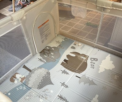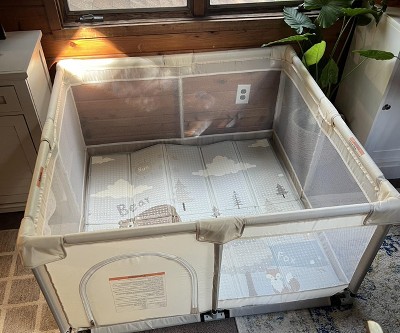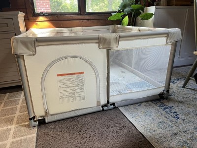 I was really looking forward to getting this playpen for my baby. It was easy to put together, does the job fine, but it doesn’t actually look like the photo. And it feels a little cheap. The photo on the website (attached) had a piece of fabric around the top of the entire playpen. This one does not. The fabric in the photo is also long enough to cover the black poles in the photo. But they actually don’t cover the poles fully so they stick out very easily. I wish it were more esthetic but it still does the job. It feels like a hassle to try and return to find a different one that looks better. I attached 3 photos of what I received and one of the screenshot of what it was supposed to look like.