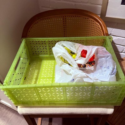 [This review was collected as part of a promotion.] This highlighter colored collapsible crate is a great way to get organized. I like to leave mine in the garage to help. Bring groceries upstairs to the pantry area. The best thing is that you can fold the crate away easily in every time you click it into place. It’s ready to go again without getting loose. You can bring up to 4 gallons of milk up at a time which is a testament to its size and quality. I received an incentive to write this review.