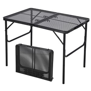 This outdoor folding barbecue table features an aluminum frame and iron mesh tabletop with a 70-pound weight capacity. The tabletop offers two height settings. Its one-button folding design ensures easy portability and storage, making it ideal for camping, barbecuing, picnics, and more. Tool-free assembly allows for instant setup and use.
