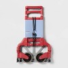 A: Hello DB - Thank you for your interest on - Folding Utility Cart. The base of the cart flips down manually – use either your hand or a foot to flip it parallel to the ground. I don’t believe there is a lock function on that portion, so having the handle extended should not prevent the base flap from opening. If it does, the guest should put the handle to the un-extended position and then open the base flap. Hope this information helps. Happy shopping! - Rose