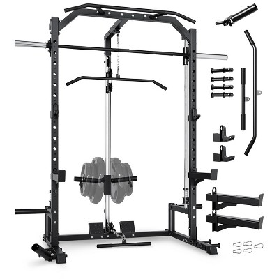 - ?Fitness Upgrade: Take your training to the next level! With included J-hooks, a pull-up bar, and a 360° landmine attachment, this heavy duty folding cage is perfect for a variety of exercises. Whether you're squatting, deadlifting, pulling up, or bench pressing, you’ll find the versatility you need to enhance your fitness routine.