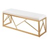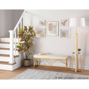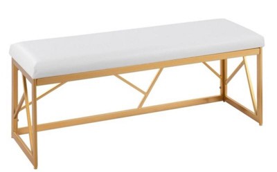 With its pleasant design and modern lines, the Folia Metal Bench by LumiSource is a unique statement in any space. Featuring a geometric gold metal frame and a plush padded upholstered cushion for added comfort. Modern elegance at its finest, the Folia Metal Bench will look great in an entryway, at the end of a bed, or paired with a dining table.