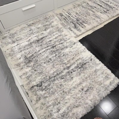 I looked long and hard to find a rug I wanted to add gray somehow without redoing all of my deccor. This rug has just enough fray in it to accomplish that. I first bought a smaller 3x5 and used it in a sitting area by my staircase. When I first opened it I thoought it may be too creamy ivory, but once on my dark hardwood floors it looked much more "white/off white" and exactly what I wanted. the rug looks really nice and is very very soft. After stairing at that little rug for a week, I went ahead and ordered the 10 x 14 and so happy I did. It came today and I rolled it out, vaccumed it and it looks just beautiful. So soft under my feet, my little dogs love it and I came downstaiirs and found my teeneage son laying on it, running his hands through it. We have a very large family room area and I was waiting to see which rug and size I wanted before addding a pad, but will get that under it asap and will make it that much more cushy. I have an dyson animal vaccum (purple one) and it does push through it, but, not gonna lie you need some muscle to get it done. The first vaccum job was the toughest and I have vaccumed it a few times now to get it all fluffed up and it is fairly easy to push it through now. I have tried so many rugs, flat rugs, shag rugs, patterned, etc. Bought rugs from many, many stores and thought I wanted something flater , but none of them looked right. I went out on a limb with this one and it payed off. love it and it really did change my "look" wiithout changing everything. It also give the texture that I needed in such a big room