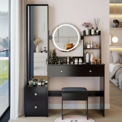 FONTOI 29.2"W/37"W/41"W Makeup Vanity Table with Left Drawer Stool Large Sliding Mirror Capacity Storage for Bedroom Dressing Room, White/Black