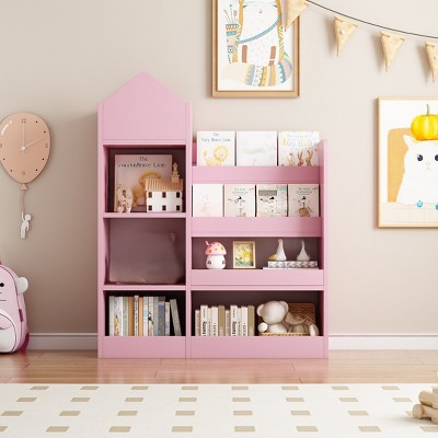 FONTOI Decorative Bookshelf, Bookcase with 6 Compartments 2 Baskets, Fabric Storage Organizer for Kids' Rooms Nursery, Wood, 11.82"*39.37"*31.5"