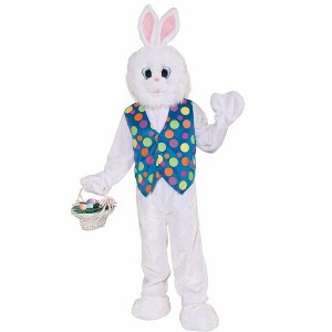 This costume is great for parades and Easter events! Deluxe in every way, this costume includes the premium full body white jumpsuit that completely covers the hands and feet, the detailed plush headpiece with fur, and the Easter-themed polka dotted vest