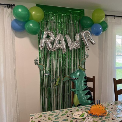- Pack includes 8 balloons in green, blue and yellow colors plus 4 silver foil balloons that spell out 'RAWR'