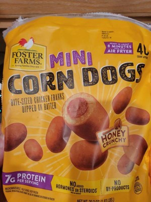 These plump, juicy hot dogs are double dipped in our delicious honey batter just like the dogs we used to enjoy while strolling along the Santa Monica pier when we were kids. Because we all know hungry kids don’t have a lot of patience, our corn dogs are fully cooked, so you can simply microwave and serve. Foster Farms Honey Crunchy Mini Chicken Corn Dogs, 29.3 Oz, 40 Ct (Frozen) are perfect for an after-school snack or a winning play for game day. Packed with protein, they are sure to satisfy even the hungriest kids. Allergens include: wheat, soy and eggs.