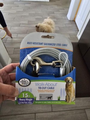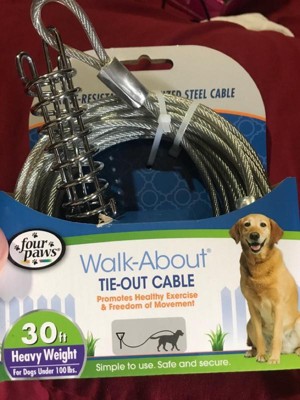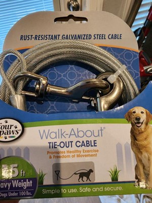 Let your dog safely roam outside with the Four Paws Heavy Weight Dog Run Cable! This tie out cable for dogs allows your pet to sniff around, exercise, and explore outdoors while staying safe and contained. The rust-proof dog run cable is made of durable aircraft cable and includes a 10-foot pulley lead. A big dog cable perfect for large backyards and dogs more than 50 pounds. Promote healthy exercise with this simple to use, safe and secure trolly tie-out cable. Your dog will thank you!
