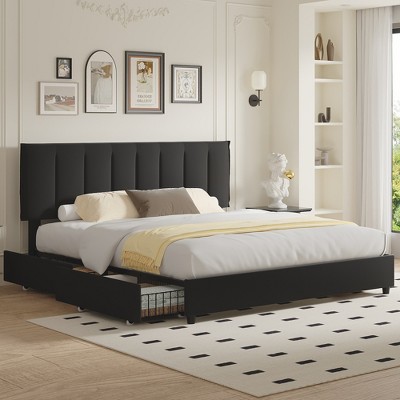 Frame with 4 Storage Drawers, Faux Leather Upholstered Platform Bed Frame, Adjustable Headboard, , No Box Spring Needed
