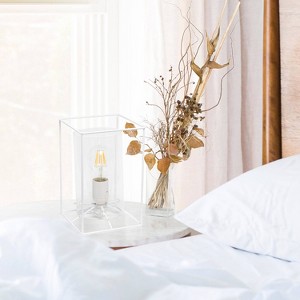 This 9" table lamp features a white metal frame with a clear glass shade that will illuminate any room in style! The simple, clean lines of the frame is complimented by the rounded cylinder shade offering a chic sophisticated look. Perfect for your living room, bedroom, office, apartment or college dorm! HELPFUL TIP: To get the complete industrial look, we recommend using a decorative Edison/Vintage bulb (not included).