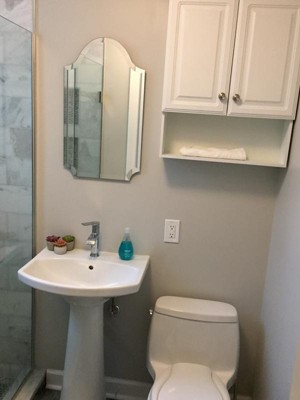 Perfect size for our smaller, newly rehabbed bathroom. It is indeed heavy but seems well made. The scalloped edges give it a touch of class.