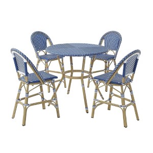 Entertain friends and family with a patio getaway. This ocean blue and white wicker-designed round counter height dining set is fit for your calm outdoor experience. The hourglass natural tone aluminum frame and plastic material tabletop are weather resistant. Water and UV resilience give this patio table set a long life for countless parties.