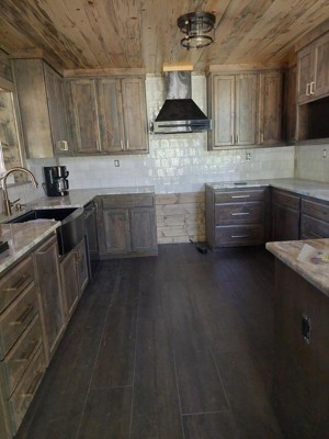 This gorgeous light was perfect for our new log cabin. The touches of black and gold helped tie together the champagne bronze fixtures and the black stainless appliances.