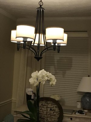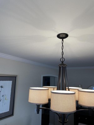 The chandelier looks great but the shades were much darker (burlap tan) than they appear in the picture. I wanted them to be more of an off-white color and had to purchase all new replacement shades. The price of the new shades almost matched the price of the chandelier which was very disappointing!