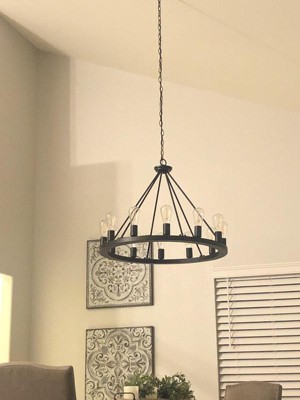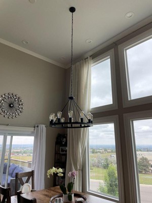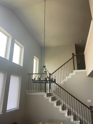 We are very happy with our new chandelier. The wagon wheel looks brings in the modern farmhouse look we were looking for. My husband was able to follow the directions to install himself without needing to hire anyone.