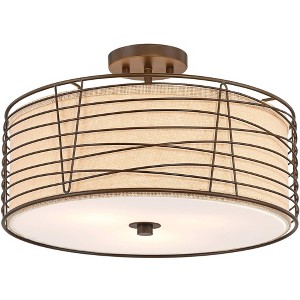 Inject visual interest and texture with this modern industrial semi-flushmount ceiling light. From Franklin Iron Works, it features a drums silhouette with a burlap inner shade complemented with an outer cage shade in bronze finish metal. A diffuser across the bottom of the drum ensures soft illumination, making this a perfect choice for bedrooms, dens, and living areas.
