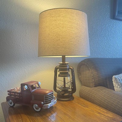 Add a hardy industrial look to your nightstand or side table with this rugged metal table lamp from Franklin Iron Works. The reddish-bronze finish base is cleverly designed to resemble a traditional coal miner's lantern, with a clear glass accent in the middle. An oatmeal fabric shade on top is the perfect finishing touch to this handsome design.