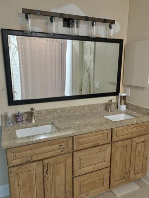We were looking for a rustic style light for our new Jack and Jill bath remodel. This Franklin Iron Works light matches the new vanity and countertop perfectly! It has a heavy, substantial look for a reasonable price. The 5 LED bulbs and mostly clear globes provide terrific light. And the width of the light is just right for our 64" vanity.