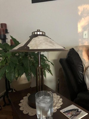 The shade is plastic. It is not mica. you can't bend mica like this. Now once you get past the deception, it's a nice lamp. Good for a desk. Maybe not for an end table in a living room. It is 20" high and I think a slightly taller lamp would be better for a couch. Base is solid. The USB port is a 2 amp charging port. The pull chains work well. It looks nice sitting there on the end table. I'm just a little chapped about the lamp shade. Here are a few pictures to let you see it before you buy it. Plastic panes held in with the same flexible metal tabs as cheap picture frames. They could have used curved glass and elevated the lamp but they cheeped out with the shade.