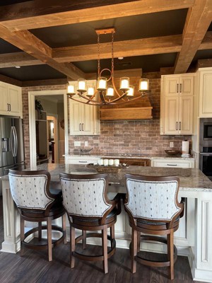 Beautiful chandelier. This is very high quality and looks stunning over our kitchen island. It's a rustic cherry wood color and looks great over our granite top and cherry wood island.