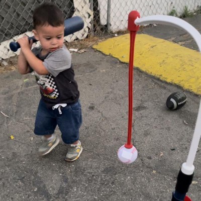 When I saw this in the store I purchased excitedly as my toddler was requesting a bat and tee. I was not thrilled with the price but we bought it anyway. Once we unboxed I was definitely less thrilled with the price. The bat was cheap plastic, the balls were thin plastic covered in a felt like fabric. Initially when I purchased, I felt like the balls were attached so you could practice hitting and the ball would stay in place. However, the ball sticks to the bar with a very loose Velcro attachment. So once the ball is hit it goes flying…which is ok if you aren’t practicing inside. However, this style ball (felt) would be disgusting after it was used outside. Once all the hair, grass, dirt, stickers were stuck to it, it no longer sticks to the Velcro.