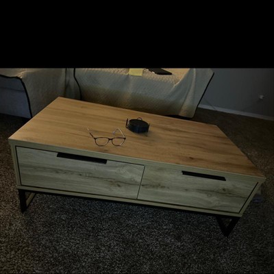 Add convenient storage to your space with the modern charm of the Franklin coffee table. Made in Malaysia, the Franklin is constructed from sturdy wood showcasing a natural oak brown finish. Two spacious drawers, along with an open shelf on the opposite side, provide handy storage for books, movies, and decorations. Requiring assembly, the Franklin is supported by black finished metal legs for excellent stability. A practical and versatile addition, the Franklin coffee table adds stylish utility to any space.
