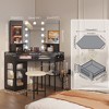 This corner vanity desk features a Hollywood-style mirror with 3-color adjustable LED lights and an integrated charging station with a power strip. It includes a spacious tabletop, storage drawers, and a comfortable chair. The versatile design combines style and functionality, making it suitable for any bedroom or dressing area.