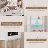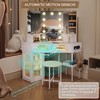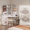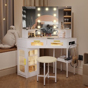 This corner vanity desk features a Hollywood-style mirror with 3-color adjustable LED lights and an integrated charging station with a power strip. It includes a spacious tabletop, storage drawers, and a comfortable chair. The versatile design combines style and functionality, making it suitable for any bedroom or dressing area.
