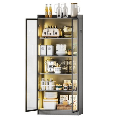 - The glass display cabinet featuring 5 spacious shelves, this cabinet offers abundant storage space for books, decorative items, or everyday essentials. The open arched shelving on the cabinet top allows for easy access and organization of your belongings.