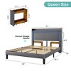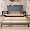This Queen-size bed frame combines an upholstered storage headboard, rolling nightstands, and an integrated charging station, offering style, comfort, and convenience. The sturdy metal frame with solid wood slats ensures long-lasting support. LED lights and adjustable reading lamps enhance bedroom comfort, while assembly is quick and hassle-free, making it an ideal choice for modern bedrooms.