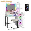 This contemporary vanity desk includes a sliding mirror with LED and RGB lighting, which can be easily adjusted using a remote control. It features large drawers for ample storage, a spacious desktop, and a matching cushioned stool. A built-in charging station with USB and Type-C ports adds to the convenience.