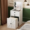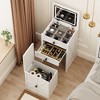 - This 3 in 1 vanity’s wooden top holds daily essentials; drawer dividers organize cosmetics, accessories, and stationery.