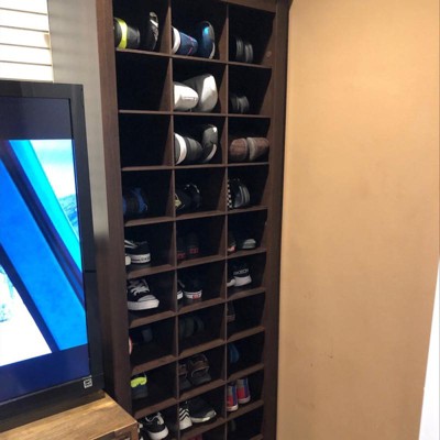 - SHOE CUBBY: Measuring 13"D x 23.5"W x 72.5"H, this shoe organizer cabinet maximizes storage with its 36 shoe cubbies. Each shoe cubby measures at 11.75"D x 7"W x 5.25"H, creating an efficient entryway shoe storage system.