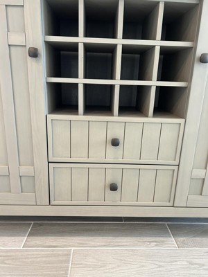 - Features two (2) central drawers with metal glides, two (2) side doors that open to large storage spaces with two (2) shelves each and a twelve (12) bottle wine storage rack.