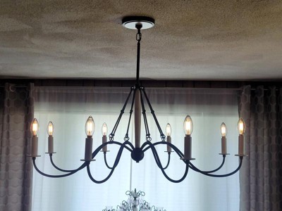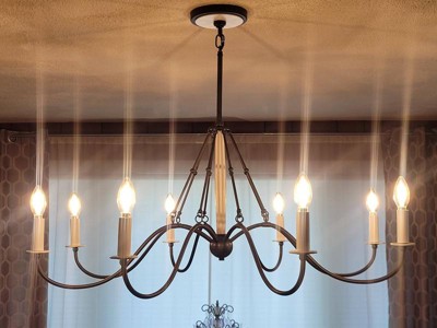 [This review was collected as part of a promotion.] This chandelier is gorgeous! I was very impressed to see that it was sloped ceiling friendly. The textured black metal gives the perfect vintage vibe to my dining room. I used eight of the candelabra B10 bulbs 60watts and it provided the perfect illumination for the entire space. I was intimidated by its large size at first, but it was just as easy to install as any other light fixture. I just had someone hold it up while I installed the wires and mounted to the ceiling. In just a few minutes I had the most gorgeous lighting I’ve ever seen, in my very own home. The candelabra bulbs enhance the vintage vibe because they look like candles on a candle stick installed on the arms of this Freesia Chandelier. I think I need some more pieces from this Freesia line.