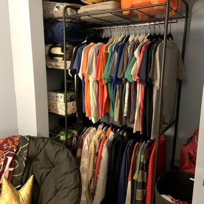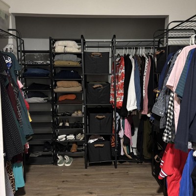 A: The closet features a black metal finish that blends with room decor.