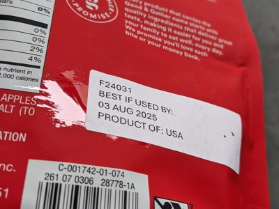 This bag had the production codes/expiration date text scraped away (the matte bag is scrubbed shiny there as you can see in the photo) with a paper label stuck on afterward. The apples are stale/tough. This is really sketchy and this product should not have been sold in this condition. I do not trust the label. I received this bag in a shipped order, and I would not have bought these myself off the shelf. I don't mind the skins and used to be happy with these apples, but the quality has been bad lately (and that goes for some of the other G&G dried fruits, too). They seem old and like they were not freeze-dried properly, all dense and tough instead of airy.