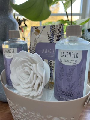 Freida & Joe Lavender Fragrance Bath & Body Collection Basket Gift Set Is a great gift for someone needs relaxation. The set comes with a lavenders shower gel bottle, a lavender bubble bath, a lavender bath salts and a white flower bath sponge! The smell of the lavender is not strong, but will give you enough comfort and rejuvenation. You can try using 3 kinds of bath items every day for a few weeks! The flower sponge is too cute to use, so I decorated the sink with it!